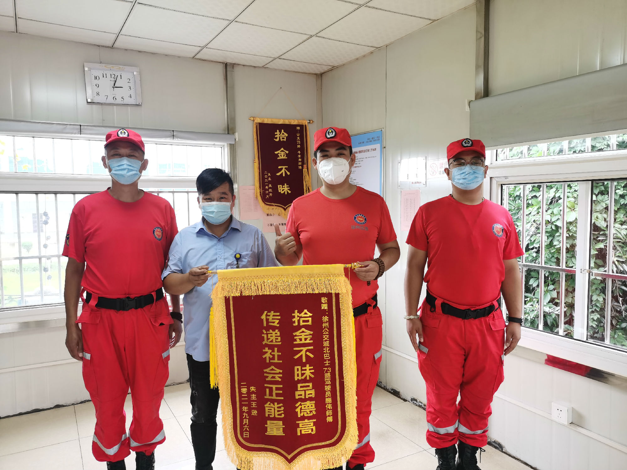當(dāng)天上午9點(diǎn)50分左右,乘客王先生從煙廠乘坐73路趕往仁慈醫(yī)院交住院費(fèi),下車時(shí)只顧拎著大包急匆匆往醫(yī)院趕,繳住院費(fèi)時(shí)才發(fā)現(xiàn)裝有現(xiàn)金的小包沒了。王先生意識(shí)到,小包可能遺落在了公交車上,于是急忙出門打車,來(lái)到了楊山路調(diào)度室找尋,沒想到小包已經(jīng)被鹿偉師傅撿到交到了調(diào)度室。王先生緊握鹿偉師傅的手連連致謝,并撥打了12345市政熱線對(duì)其進(jìn)行了表?yè)P(yáng)。97日中午,他又帶著錦旗來(lái)到楊山路調(diào)度室,再次對(duì)鹿師傅拾金不昧精神表示感謝。
