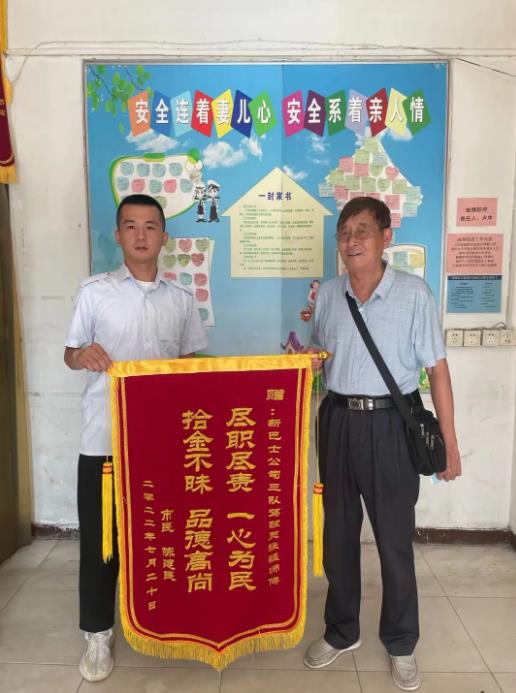 2022年7月25日上午,市民陳老先生拿著一面印有“盡職盡責(zé)一心為民,拾金不昧品質(zhì)高尚”的錦旗,來到徐州公交新巴士公司湖濱調(diào)度室,表?yè)P(yáng)和感謝18路公交駕駛員張猛。