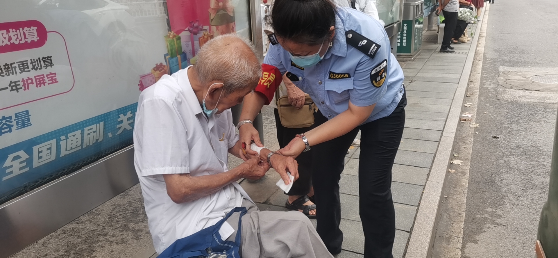 8月2日上午8時許,公交督導(dǎo)員孫琪在朝陽站開展站臺執(zhí)勤工作時,突然聽到有人大喊:“快來救一下,有人摔倒了!”孫琪當(dāng)即上前查看情況,發(fā)現(xiàn)一位老人癱坐在站臺上,不停地喘著粗氣,胳膊上有一個大傷口,鮮血直流。