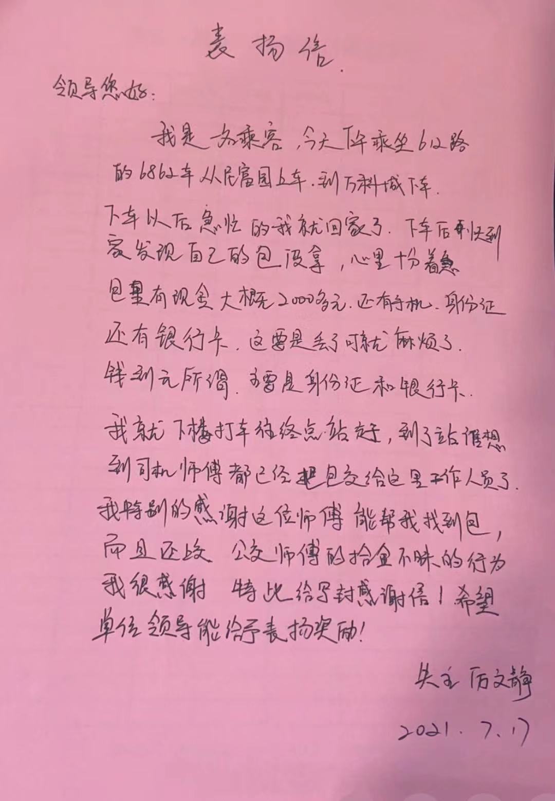 “到家后,我發(fā)現(xiàn)包不見,于是抱著試試看的心態(tài),來到九里停車場調(diào)度室詢問,沒想到好心的公交司機(jī)幫我找到了。”厲大姐緊握王師傅的手連聲致謝,當(dāng)場寫下了一封表揚(yáng)信。